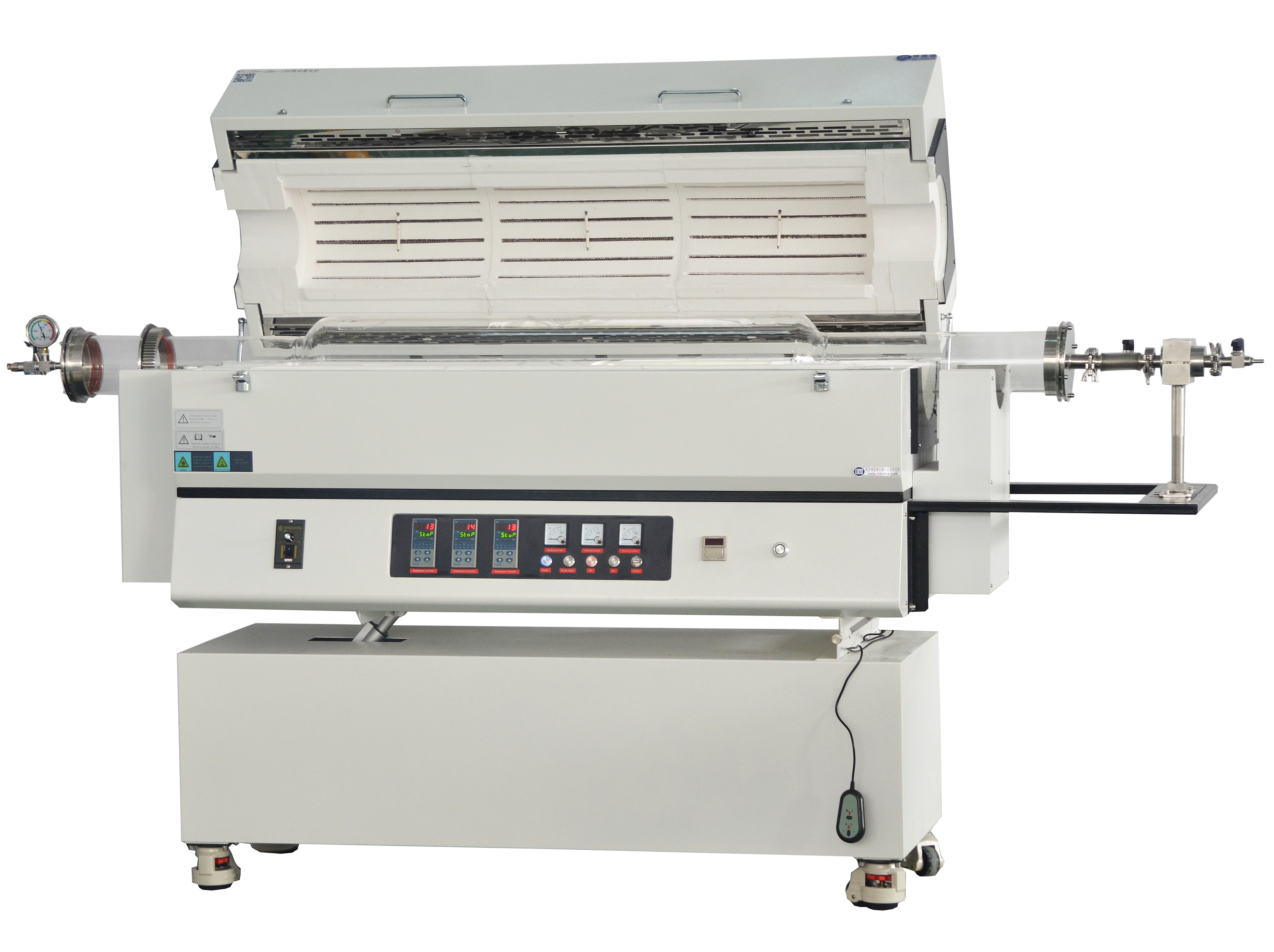 该转动管式炉最高温度1200度,分三个温区,加热段400+400+400,